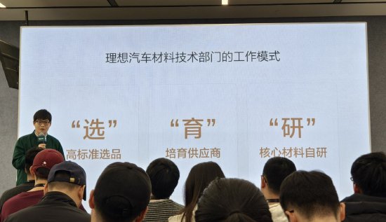 他表示,这也与理想汽车的“选、育、研”材料方法论高度同源。其中,“选”是基础,理想汽车会基于严格的标准,选择行业内最优秀的材料方案,打造好的产品基础;其次是“育”,当行业标准品无法满足理想汽车的性能要求,就通过牵引或培育供应商开发更高性能的新材料;最后是“研”,面对研发难度更大的无人区技术,理想汽车会选择自研。