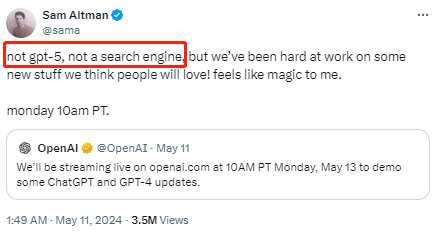 这个神秘的新产品是什么?GPT-5和搜索引擎的推测已被OpenAI 首席执行官阿尔特曼亲自推翻。