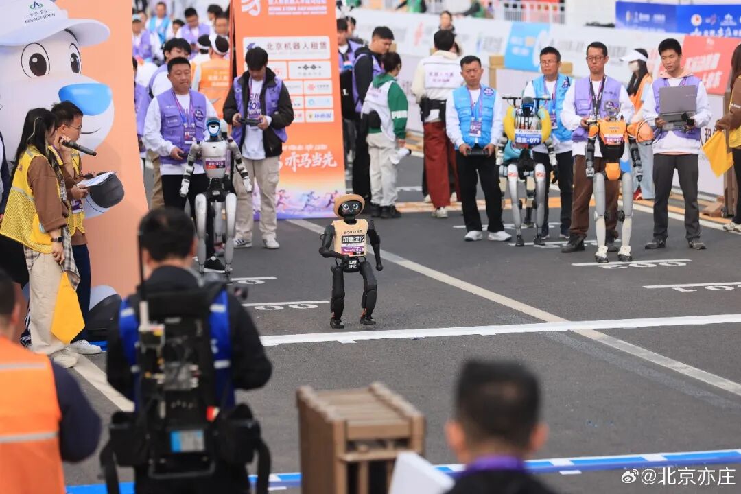 本次半程马拉松共吸引100余支队伍、300余台机器人参赛,阵容比去年豪华,有去年的冠军选手天工,有春晚红人宇树、松延动力,还有来自各大高校和海外的团队。